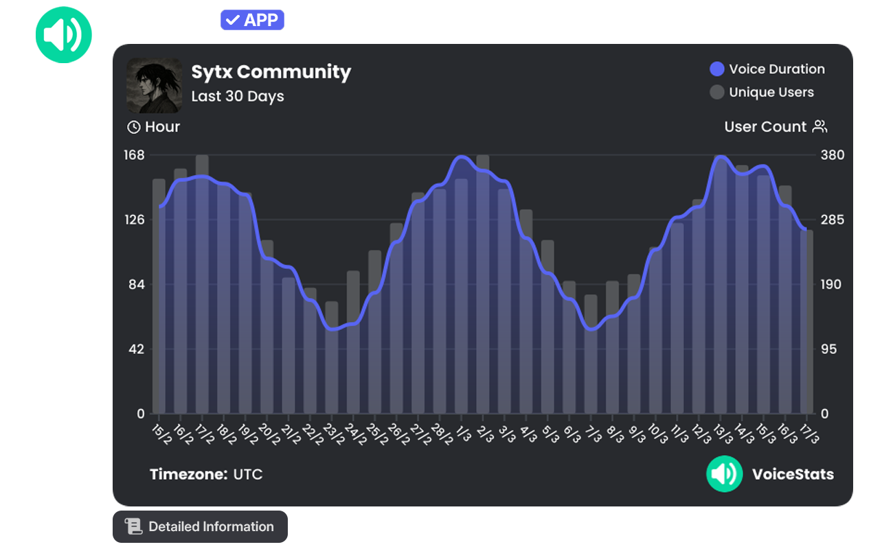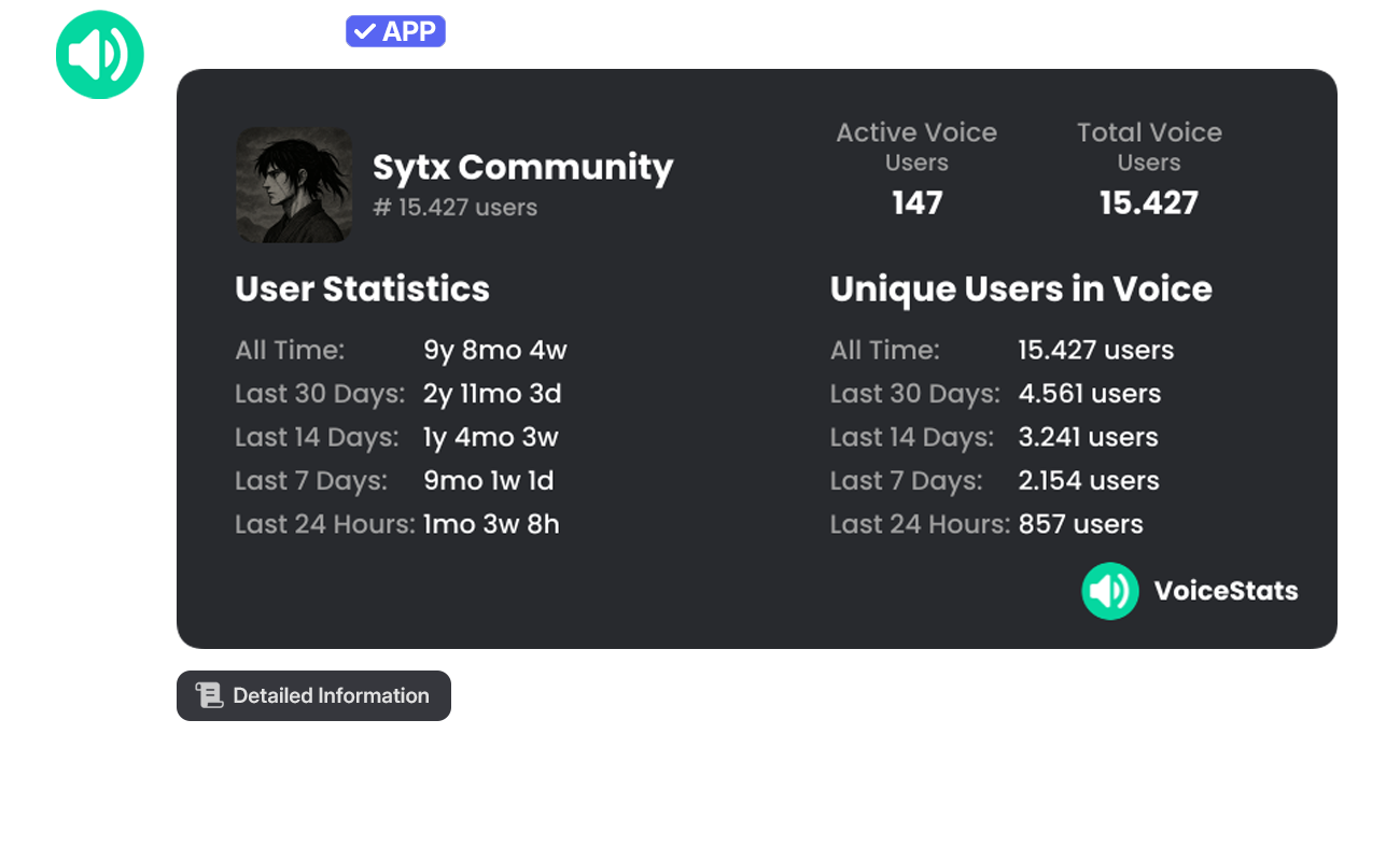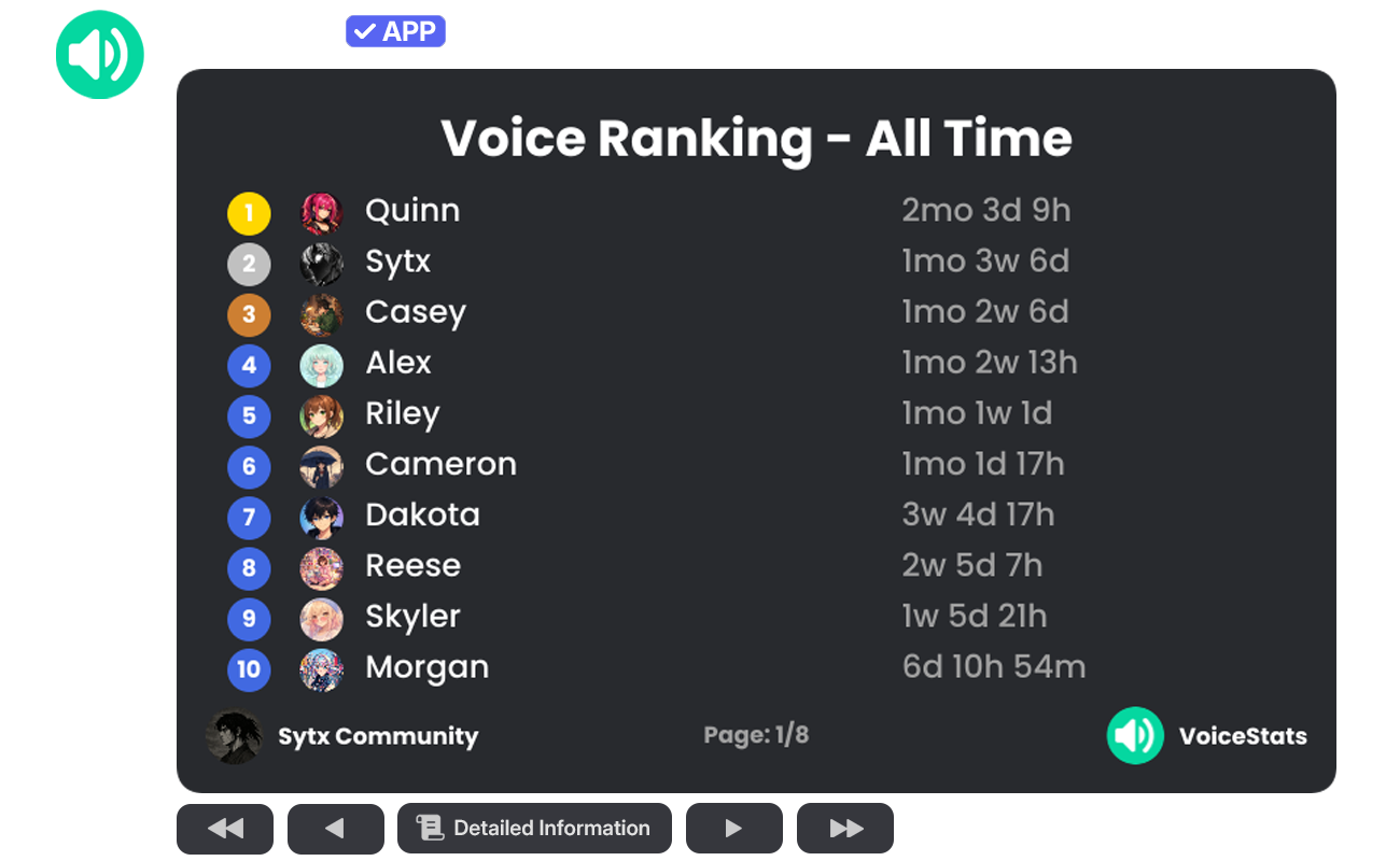 Commands that display server-wide voice chat rankings and the overall statistics of the community.